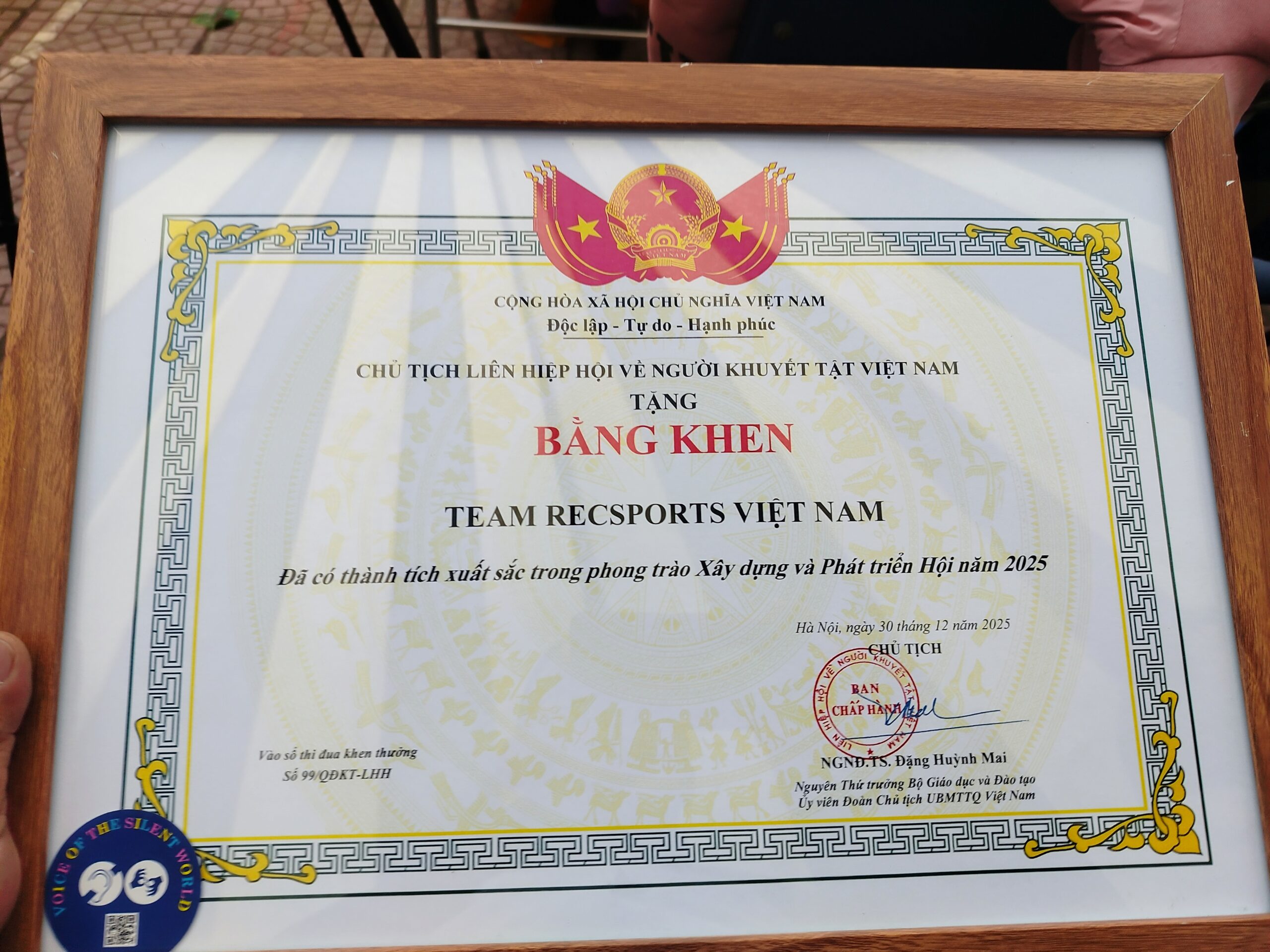 RecSports vinh dự nhận bằng khen của Liên hiệp hội về NKT VIỆT NAM